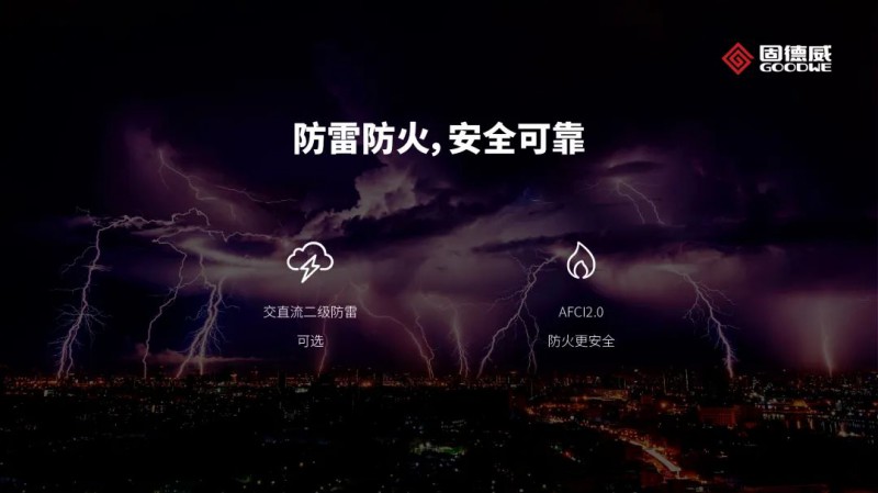 由于户用光伏电站大多是安装在家庭的屋顶上的,所以电站的安全变成了头等大事,一但发生事故后果不堪设想。为保障客户生命财产安全,固德威在设备安全方面做了颇多付出,现在已经开发出AFCI2.0(直流拉弧检测),25kW机型可以加装选配,直流拉弧检测不误报、不漏报,几乎100%保障直流侧安全。另外,25kW机型在直流侧和交流测都有防雷设置,杜绝雷击隐患,防雷更安心。