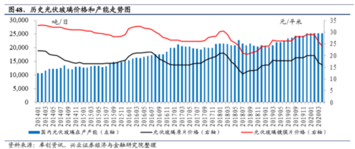 (3)2018年9月开始至2020年初的光伏玻璃涨价周期:在2018年“531”政策后,光伏玻璃价格经历了四个多月的底部运行期间,一度价格跌至历史最低的21元/平米,中小企业提前冷修部分产能,而下游装机在下半年国内和海外需求拉动下需求尚可,光伏玻璃价格于9月底开始企稳缓慢回升,11月开始提升至24元/平米。随后的2019年3月和9月和12月,玻璃又迎来了三次涨价,最终涨至29元/平米维持至2020年3月。