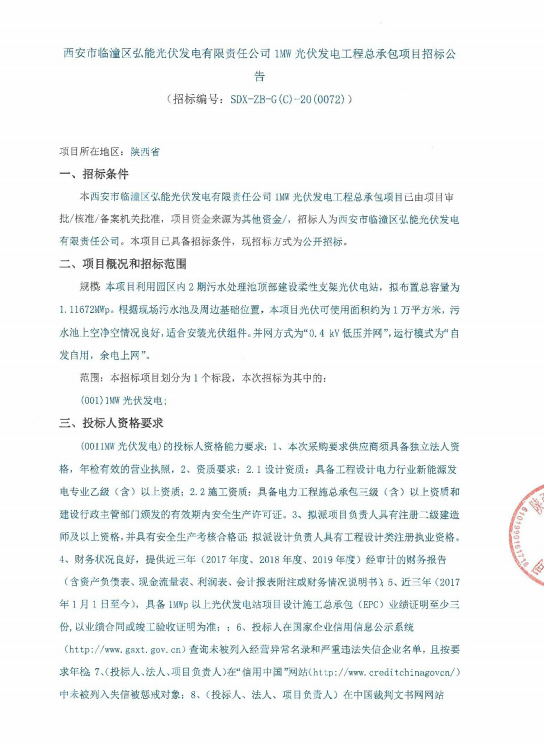 9月1日,华能蒙东公司赤峰基地集中式光伏项目设计管理+PC总承包招标公告发布,招标人为华能内蒙古蒙东新能源有限公司。大唐150MW光伏项目PC总包招标9月2日,大唐建投怀安新能源有限公司15万千瓦光伏项目主体工程PC施工总承包招标公告发布,招标人为大唐建投怀安新能源有限公司。公告显示,该项目位于河北省张家口市怀安县,建设规模为150MW。本次招标不接受联合体投标。