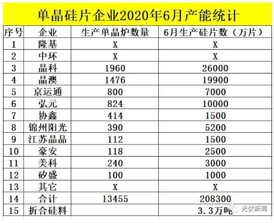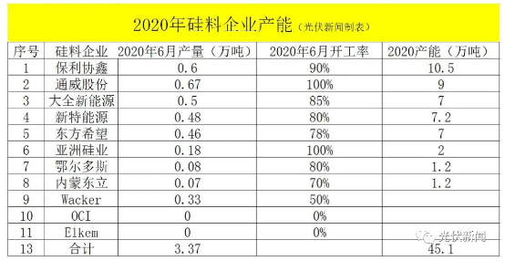 之前单晶致密料价格跌破60到58元/公斤,最低时铸造多晶硅价格也到了26-27元/公斤,这个价格比一些多晶硅企业的现金成本还低,因此大部分多晶硅企业纷纷停产减产。小编对多晶硅企业2020年6月的产能与硅片企业6月的产能做了一个调研。2020年6月,全球多晶硅企业的实际产量在3.37万吨左右,其中2.9万吨单晶用料,0.47万吨铸锭用料。调研中还发现,国内多晶硅企业只有通威、亚洲硅业在满产,即便协鑫、大全、特变、东方希望都没有满产,而国外多晶硅企业仅仅只有瓦克开了50%左右的产能,其余多晶硅巨头如韩国OCI、马来西亚OCI、挪威Elkem等都已经停产。因此,即便国内两家多晶硅巨头发生事故不能满产,只要其余多晶硅厂家满产,就可以马上满足硅片企业对多晶硅的需求。