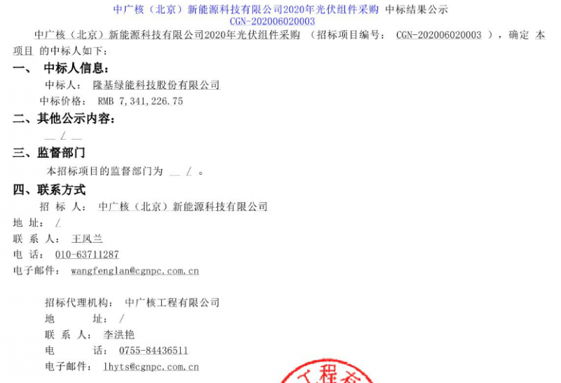 8月5日,中广核(北京)新能源科技有限公司2020年光伏组件采购中标结果公示,隆基绿能科技股份有限公司以7341226.75元中标。