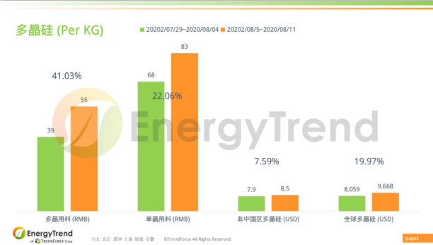 2020年8月5日的报价,大陆多晶用料价格从 RMB39/KG 大幅上涨至 RMB55/KG,涨幅达到41.03%;单晶用料价格从 RMB68/KG 上涨了 22.06% 来到 RMB83/KG。非中国区多晶硅料人民币价格为 US$8.5/KG,比之前的 US$7.9/KG 增长了 7.59%;全球多晶硅料的最新均价为 US$9.668/KG,较之前的 US$8.059/KG 增加了 19.97%。