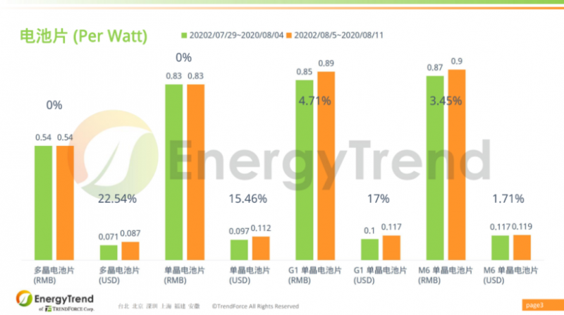 常规多晶电池片保持在 RMB0.54/W;美金报价从 US$0.071/W 上涨至 US$0.087/W,涨幅为22.54%。常规单晶电池片的人民币最新价格为 RMB0.83/W;美金价格上涨至为 US$0.1112/W,涨幅为 15.46%。G1单晶电池片人民币价格从 RMB0.85/W 持续增长了 4.71% 来到 RMB0.89/W;美金报价上涨 17%,为 US$0.117/W。M6单晶电池片人民币价格为 RMB0.9/W,较之前增加了 3.45%;美金报价从 US$0.117/W 大幅上涨 1.71%,来到 US$0.119/W 。