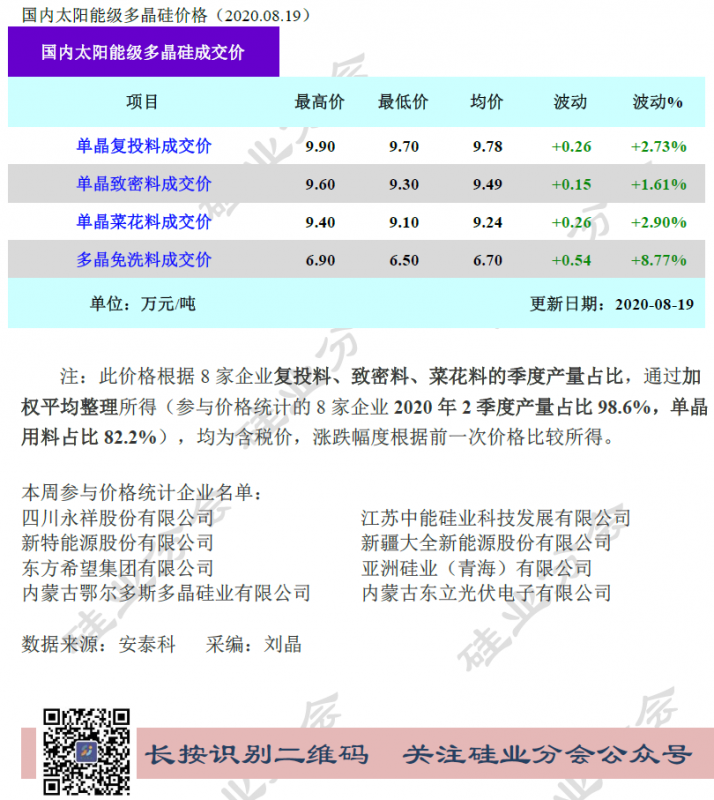 本周多晶硅市场价格延续上涨走势,包括复投料、单晶致密料、单晶菜花料、多晶免洗料均有不同程度上涨,涨价幅度周环比略有收窄,新成交企业数量环比增多。本周硅料价格继续上涨,主要仍是由于多晶硅供应严重短缺所致,一方面新疆地区四家多晶硅企业尚在检修中,影响产能半数以上的产出,另一方面新增两家万吨级企业分别因防汛及设备维护停产、检修,在原本硅料已经供应短缺的情况下,进一步加剧了市场供不应求的局面,故本周多晶硅价格继续维持上涨走势。