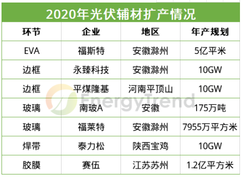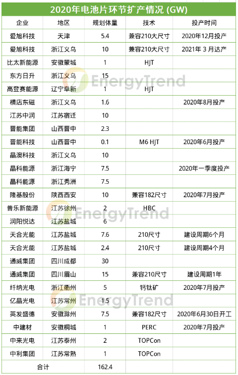 2020年市场需求虽饱受新冠疫情影响,但光伏企业的扩产积极性不减,当前业内对大尺寸产品布局达成共识,根据不完全统计,2020年组件依旧是供应链扩张规模最大的环节,到2021年主流企业大尺寸产能开始规模化释放。