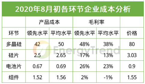 根据8月初各环节企业成本分析,在供应链价格全面上涨的市况下,无论是领先企业还是行业平均水平,组件产品的成本上涨幅度与毛利率远低于上游各环节水平。
