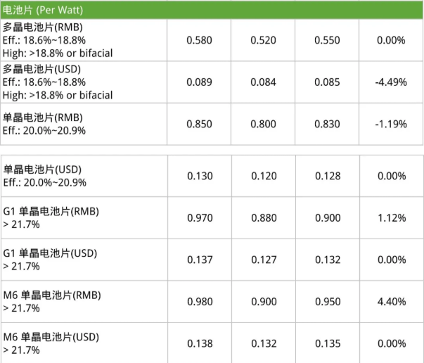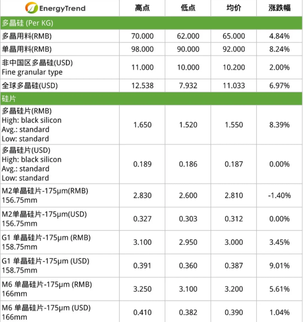 本周硅片市场价格仍是呈现一路上涨的局面。反映上游硅料价格持续上涨的影响,让硅片成本不断向上提高,尽管市场上抗议声浪不断,且多数下游电池厂商反馈下游终端的需求不足,无法承压上游的不断提价,但硅片企业仍旧同步调涨价格,并表态在硅料价格不断向上的情况下,硅片报价仍会跟进调涨,目前多晶硅片价格涨至1.52-1.65元/片,同时G1、M6单晶硅片差价继续拉大,均价已分别上调到3元/片和3.2元/片。