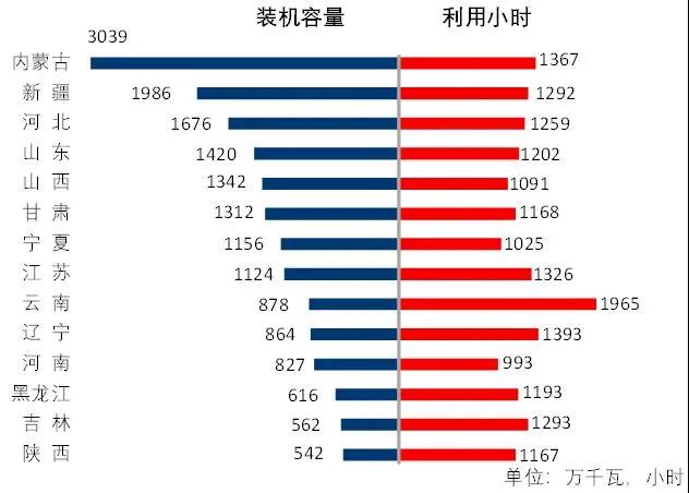 图3 1-7月份风电装机较多省份风电装机容量和设备利用小时