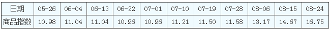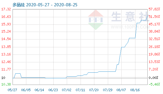 8月24日多晶硅商品指数为16.75,较昨日上升了0.42点,较周期内最高点100.00点(2011-09-08)下降了83.25%,较2020年07月01日最低点10.96点上涨了52.83%。(注:周期指2011-09-01至今)