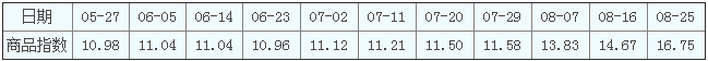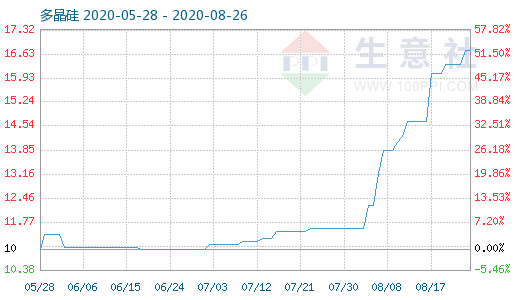 8月25日多晶硅商品指数为16.75,与昨日持平,较周期内最高点100.00点(2011-09-08)下降了83.25%,较2020年07月01日最低点10.96点上涨了52.83%。(注:周期指2011-09-01至今)