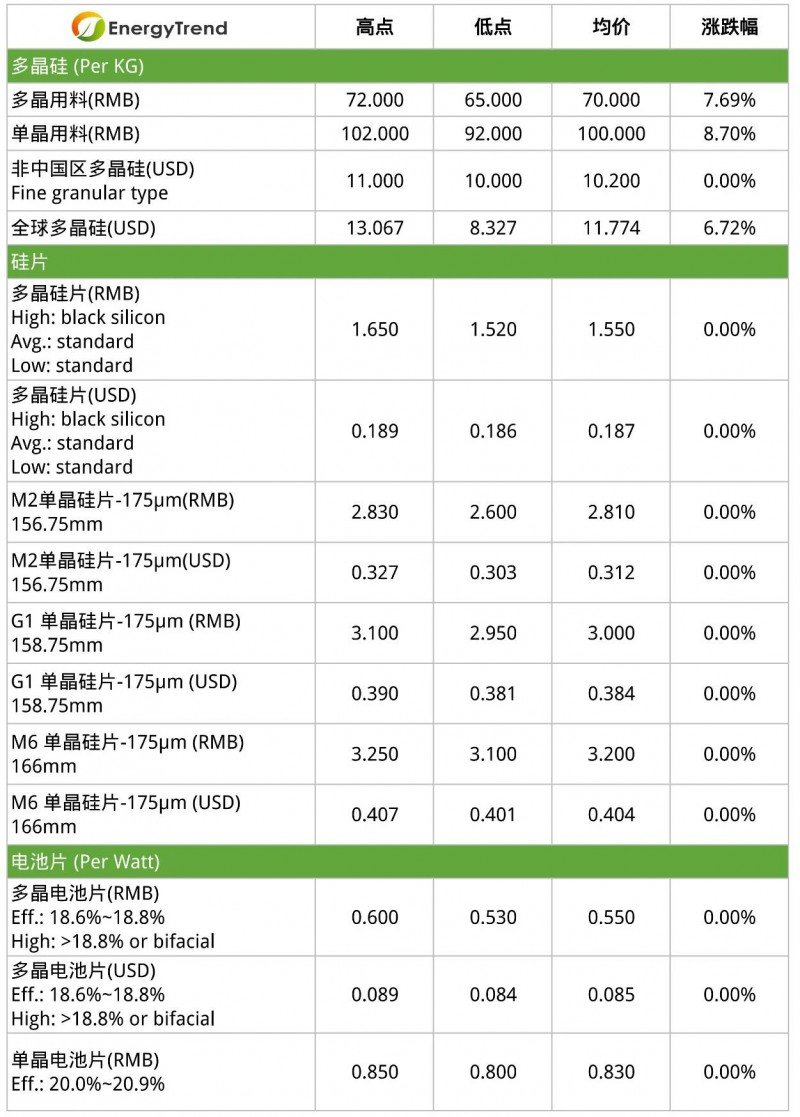 本周硅料价格仍维持上涨走势,临近月底硅料价格再创新高,其中单晶用料价格上调至92-102元/kg,均价达到100元/kg,多晶用料均价突破70元,价格区间达到65-72元/kg。主要原因还是与前几周相同,部分硅料企业停产检修导致硅料供给供不应求,但预估本周以后硅料市场涨幅会逐渐收窄。目前新疆地区硅料企业逐步续恢复生产,供应已逐渐恢复,让短缺现象可以逐渐缓解。同时下游企业对于硅料的连续剧烈涨幅的接受度渐趋降低,种种成因才让硅料市场的价格涨幅开始在上涨走势中逐渐收窄,也有新疆硅料厂指出,由于物流方面交通管制,货运时效性与正常时期相比受到影响,运输成本有一定上升,但硅料供应已逐渐顺畅,9月缺料情况有望进一步缓解。