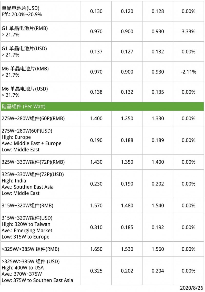 本周电池片价格小幅震荡,特别是单晶的部分。上游硅片不断涨价,下游组件价格涨不起来,因此让电池片环节承压情况最为严重。单晶电池片方面,目前G1 单晶电池片G1与M6单晶硅片价格已持平,均价达到0.930元/W。邻近月末,厂商已经开始洽谈九月订单,部分组件厂反馈对于电池片的采购价格明显低于报价,压价情况在二三线厂尤为严重,反倒是多晶电池片随着组件成本的抬升,市场上开始转而青睐多晶电池片,因此让多晶电池片需求有稳定的支撑。