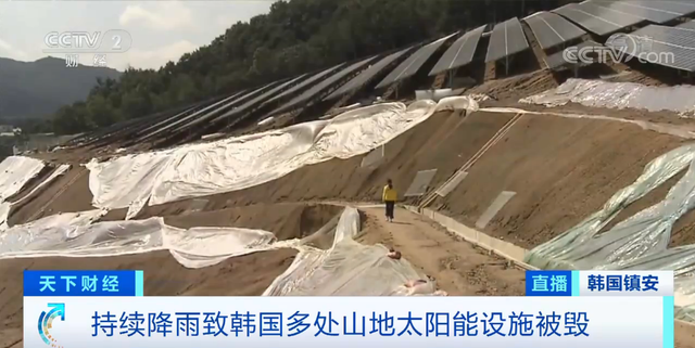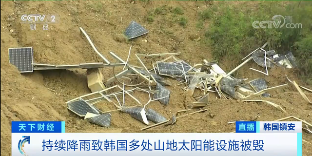 全罗北道是韩国推进太阳能项目的重点地区,拥有韩国最大的清洁能源综合性产业园区。今年7月下旬到本月初,韩国集中暴雨引发山体滑坡,27处建在山坡上的太阳能发电设施被毁。在现场依然可以看到被泥沙冲坏的太阳能电池板散落四周,损毁情况非常严重,很多已经完全扭曲变形。