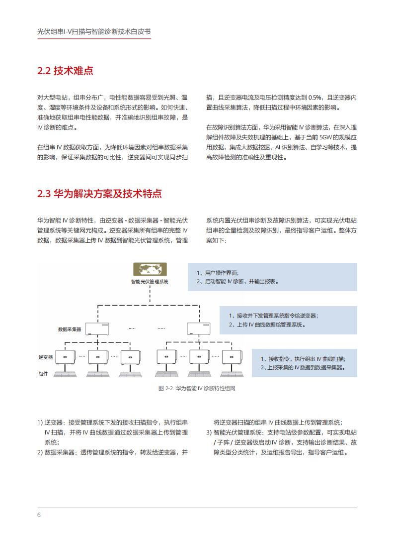 目前,华为技术有限公司(以下称"华为")智能I-V 诊断功能已进入规模应用阶段。截至目前,华为智能I-V诊断应用已超过5GW,广泛应用于各类不同站址条件、系统和设备形式。