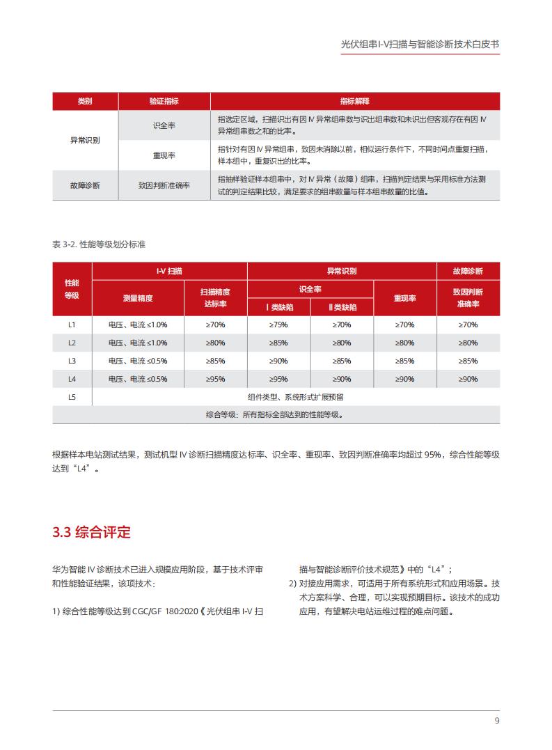 为证实I-V扫描与智能诊断技术的性能水平,受华为委托,北京鉴衡认证中心(以下称"鉴衡")对该技术进行了技术评审和性能验证。结果表明∶依据 CGC/GF 180:2020《光伏组串I-V扫描与智能诊断评价技术规范》、IEC624461∶2016《并网光伏系统 第一部分∶系统文件、试运行测试和检查要求》,华为开发的智能L-V诊断技术,综合性能水平达到"L4",可以较好地满足应用需求。