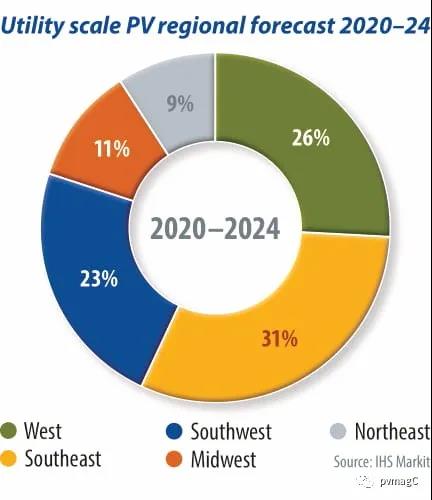 公用事业市场的需求,推动了美国南部太阳能光伏项目的安装量激增。IHS Markit预测,从2020年到2024年,美国东南部和西南部地区将分别占公用事业级项目总需求的31%和23%。
