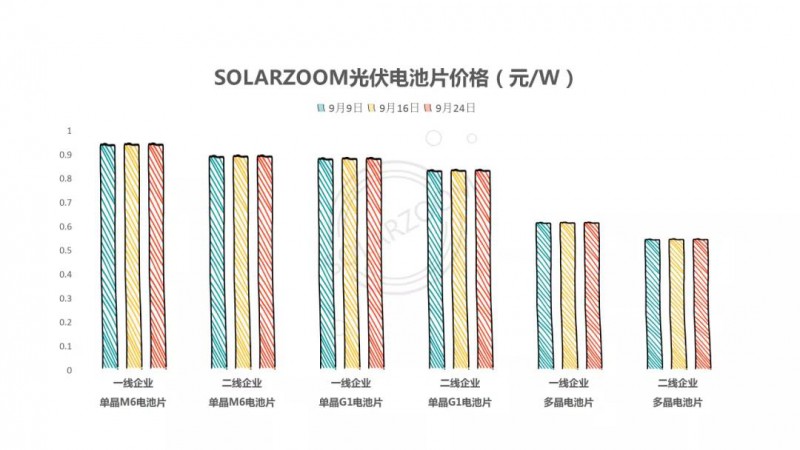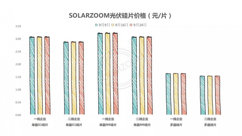本周国内单晶硅片价格基本持稳,由于目前下游主流需求集中逐步在往单晶M6倾斜,单晶M6硅片的需求也是递增,国内单晶硅片企业也是逐步加大或计划加大单晶M6硅片的生产量,而相应的单晶G1硅片产出逐步减少,但下游单晶G1仍有部分需求,故而单晶G1硅片价格也是较为坚挺;单晶M6硅片价格高位坚挺,主流价格区间在3.1-3.25元/片,市场主流厂商成交基本在3.2元/片以上,单晶G1硅片价格维持在3-3.08元/片,对于10月报价国内单晶龙头企业此次未调价,基本维持9月报价水平。多晶方面,本周多晶硅片价格区间基本与上周持平,中效多晶硅片价格在1.3-1.35元/片,高效多晶硅片价格在1.55-1.65元/片,但随着上游多晶用料价格的小幅走弱,多晶硅片在实际成交上略有0.02-0.03元/片的让步空间。
