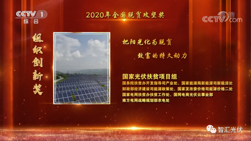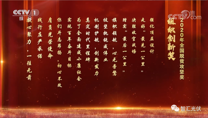 2020年10月17日,在中央电视台主办的《决战的时刻——2020年全国脱贫攻坚奖特别节目》中,光伏扶贫,被作为典型案例进行专门的报道,并获得——组织创新奖!