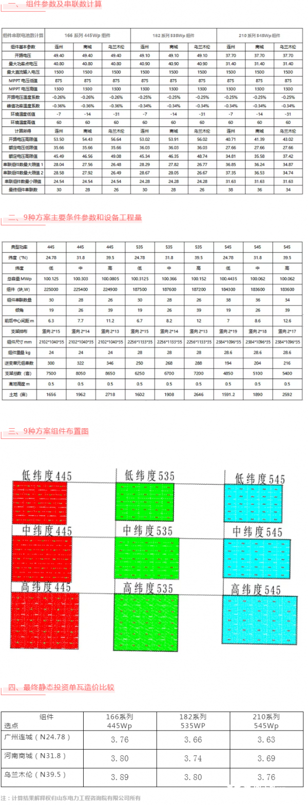 为此,山东电力工程咨询院有限公司针对目前市面上主流的组件类型(166型445Wp组件、182型535Wp组件、210型545Wp组件),以及不同纬度(北纬24.8°广州连城、北纬31.8°河南商城、北纬39.5°内蒙乌兰木伦)的资源环境条件,做了详细的工程量计算、成本分析和投资收益对比,具体对比如下: