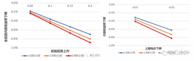 投资每增加0.05元/W,全投资内部收益率大概会下降0.2%左右;增加0.2元/W,全投资内部收益率大概会下降0.8%左右;上网电价每下降0.01元/kWh,全投资内部收益率大概会下降0.35%左右;下降0.02元/kWh,全投资内部收益率大概会下降0.6%~0.8%。