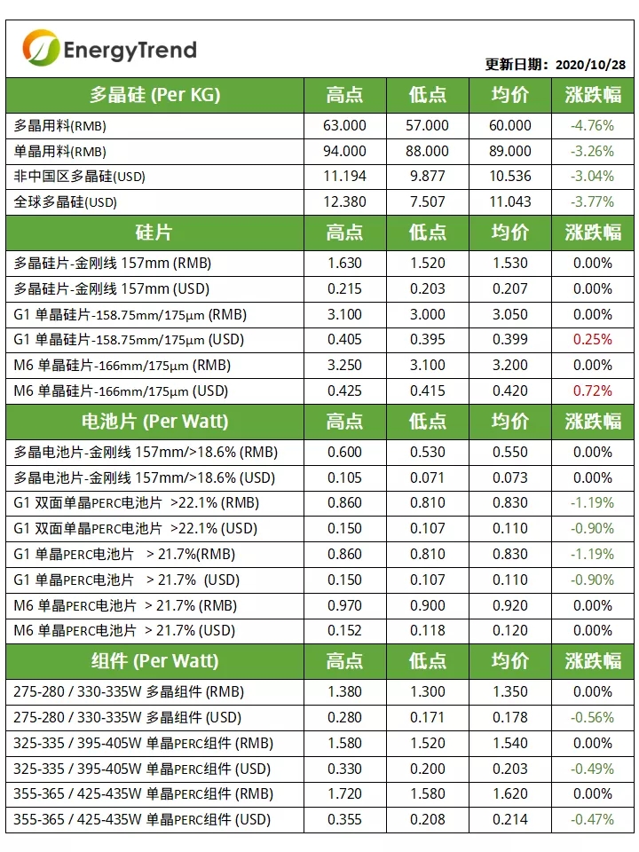 受玻璃、EVA等辅材价格上调影响,本周组件报价持续坚挺。其中325-335 / 395-405W 单晶PERC组件均价稳定在1.54元/W,355-365 / 425-435W 单晶PERC组件主流价格在1.58-1.72元/W,均价在1.62元/W。特别是一线企业,11月订单几乎已排满,出单顺畅,部分量小订单报价调涨,甚至有425W单晶组件报价达到1.72元/W。多晶组件方面,目前275-280 / 330-335W 多晶组件均价在1.35元/W,除部分一线企业的报价大体持平外,二三线组件企业的报价无法统一,报价区间较大,1.3-1.38元/W不等。