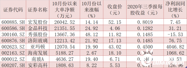 表:10月份以来实现大单资金净流入的光伏玻璃概念股