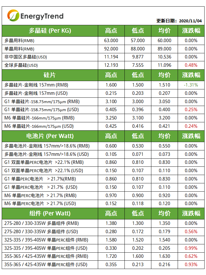 目前来看,受终端需求大尺寸、高效化趋势影响,G1单晶硅片需求逐渐转弱,M6以上(≥166mm)尺寸的单晶硅片产品报价坚挺,一线企业的11月订单基本已签订。多晶方面,随着下游多晶需求的走弱,四季度以来多晶硅片价格不断松动,除部分高效产品跌幅较小外,其他中低效产品的价格持续下探,大部分企业反馈经营压力大。