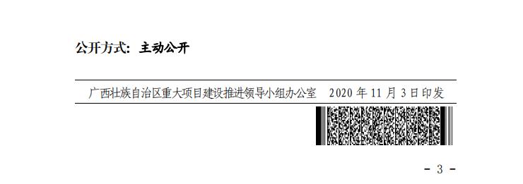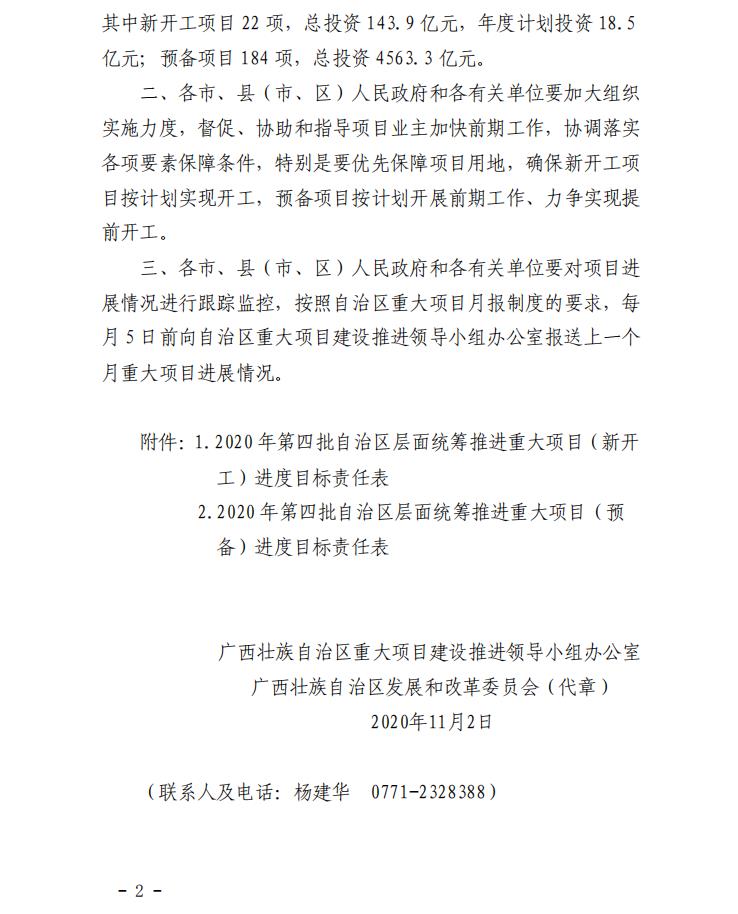 11月4日,广西壮族自治区发改委公布2020年第四批自治区层面统筹推进重大项目计划,列入2020年第四批自治区层面统筹推进重大项目计划的项目共206项,总投资4707.2亿元,年度计划投资18.5亿元。其中,新开工项目22项,总投资143.9亿元,年度计划投资18.5亿元;预备项目184项,总投资4563.3亿元。