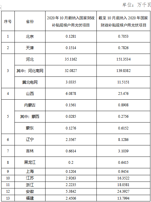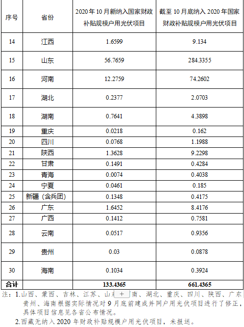 按照《国家能源局关于2020年风电、光伏发电项目建设有关事项的通知》(国能发新能〔2020〕17号,以下简称《通知》)和《国家能源局综合司关于2019年户用光伏项目信息公布和报送有关事项的通知》(国能综通新能〔2019〕45号)关于户用光伏项目管理有关要求,全国共有30个省份报送了户用光伏项目信息(西藏无纳入2020年财政补贴规模户用光伏项目,未报送)。根据各省级能源主管部门、电网企业报送信息,经国家可再生能源信息管理中心梳理统计,2020年10月新纳入国家财政补贴规模户用光伏项目总装机容量为133.44万千瓦,详细情况见附表。