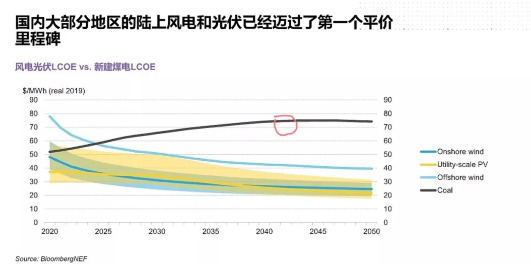 而在彭博的报告中,预计中国未来五年大部分地区将迎来陆上风电和光伏的“第二个平价里程碑”,即LCOE将低于煤电边际成本。