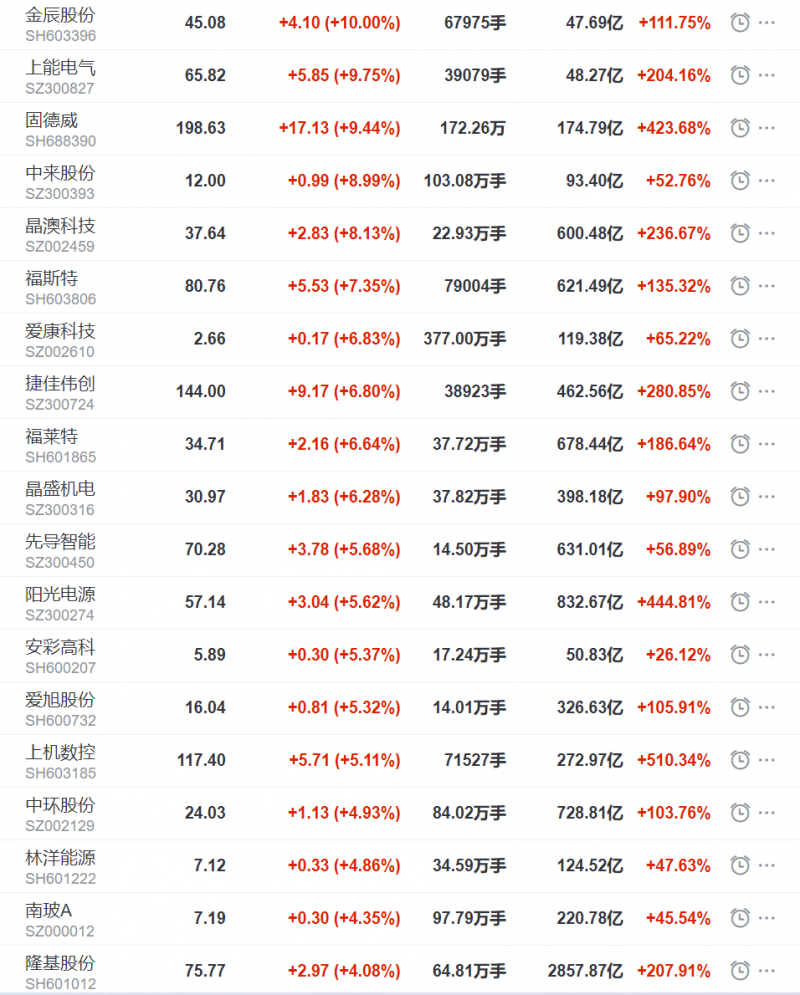 12月14日,习近平主席宣布中国应对气候变化国家自主贡献新举措后的第一个交易日,光伏上市公司股价集体上涨。据索比光伏网统计,A股超40只光伏股票出现上涨,其中主板金辰股份涨停,晶澳科技涨8.13%、福斯特涨7.28%、爱康科技涨6.83%,创业板上能电气涨9.75%、中来股份涨8.99%、捷佳伟创涨6.80%,科创板固德威涨9.44%。