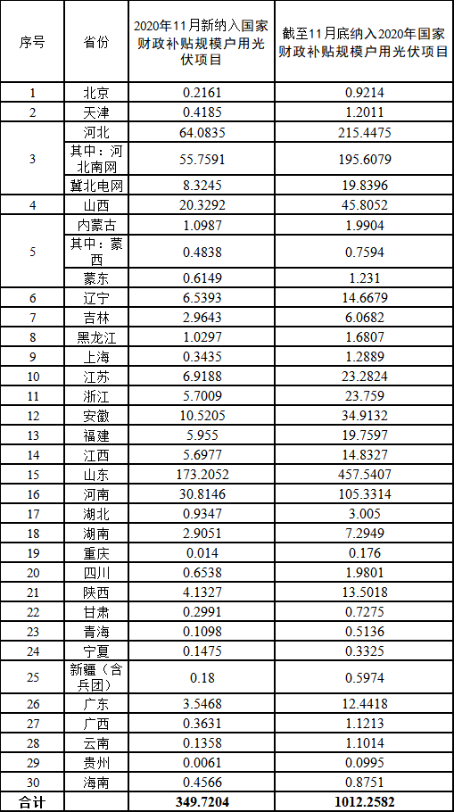 根据各省级能源主管部门、电网企业报送信息,经国家可再生能源信息管理中心梳理统计,2020年11月新纳入国家财政补贴规模户用光伏项目总装机容量为349.72万千瓦。截至2020年11月底,全国累计纳入2020年国家财政补贴规模户用光伏项目装机容量为1012.26万千瓦。详细情况见附表。