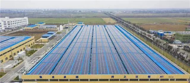 无人机从空中拍摄,一排排蓝色停车场蔚为壮观,另外,厂区房顶也装上光伏发电设施。