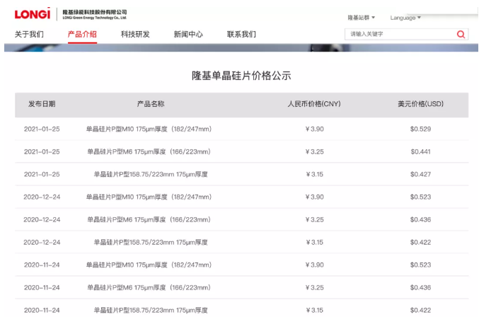 从公示信息看,G1(158.75mm)、M6(166mm)、M10(182mm)三种尺寸硅片国内报价保持不变,分别为每片3.15元、3.25元和3.90元。同时,受汇率变动影响,海外报价略有上涨,最新价格为每片0.427美元、0.441美元和0.529美元。