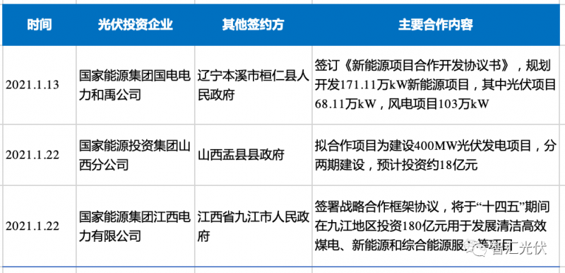 近期,国家电投集团下属单位签署重大合作4项,涉及江西、山西、贵州、辽宁等省份;储备各类项目总规模超过2.1GW。