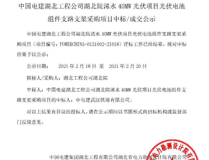 10月21日,中国石油华北油田公司2025年A28大类光伏支架集中采购中标结果公告项目分为2个标包,第一标包为固定式光伏支架,中标企业3位:天津星宇达新能源科技有限公司、天津君诚管道实业集团有限公司、河北迈进电器有限公司;第二标包为废旧油管改造光伏支架,中标企业3位:霸州市老边幕墙金属材料有限公司、南昌南飞防火设备制造有限公司、衡水科航金属结构有限公司。要求送货至华北油田公司各区域,交货时间凭买受人通知。