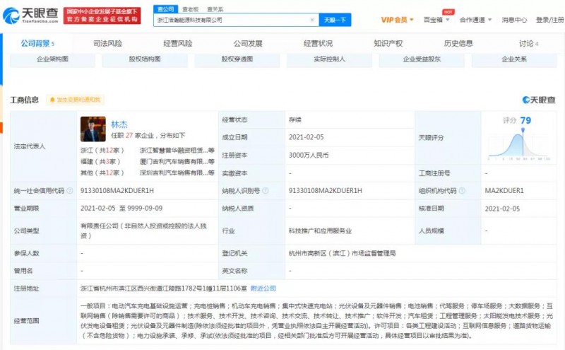 2月5日,吉利汽车成立浙江浩瀚能源科技有限公司,注册资本3000万人民币,根据天眼查公开信息显示,公司法定代表人为林杰,由吉利汽车集团有限公司全资持股,疑似实际控制人李书福。经营范围含电动汽车充电基础设施运营;光伏设备及元器件销售;太阳能发电技术服务;互联网信息服务等。