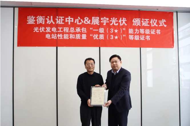 鉴衡(副主任纪振双)为展宇光伏(总经理宋钰)颁发《光伏发电站性能和质量等级评定证书》