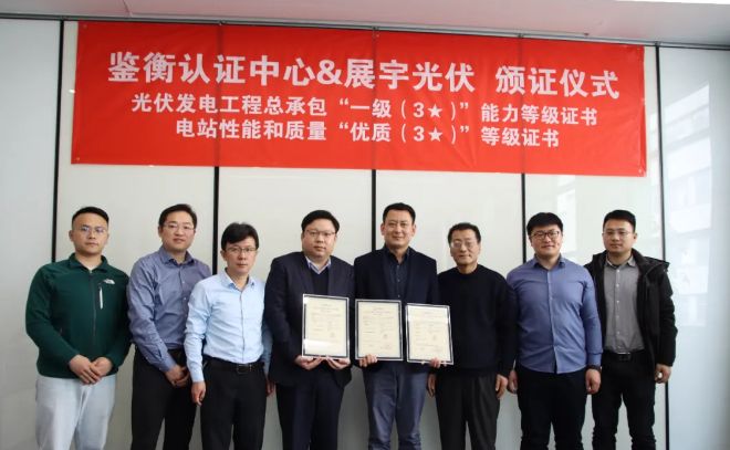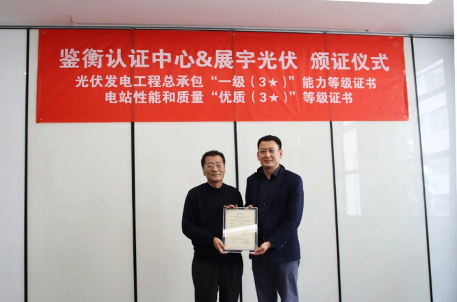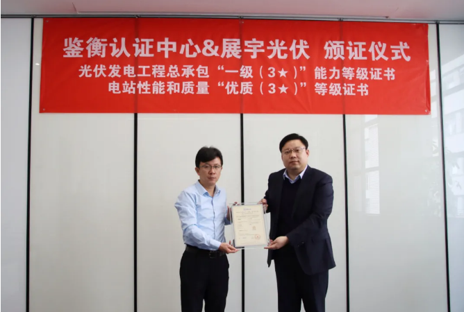 3月16日,鉴衡认证中心向江西展宇光伏科技有限公司(以下称“展宇光伏”)颁发光伏发电工程总承包“一级 (3星) ”能力等级证书【最高等级】,向展宇光伏承建的“敦煌20兆瓦光伏发电项目”、“唯品会40.6兆瓦分布式光伏发电项目”颁发电站性能和质量“优质(3星)”等级证书【最高等级】。展宇光伏成为首个获得鉴衡新版《光伏发电站认证技术规范》的认证企业。