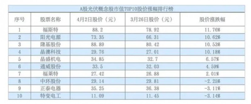 据记者统计,A股光伏概念股市值前10的企业中,3家股价下跌,剩余概念股股价均存在不同程度的上浮。市值前十名的光伏概念股公司中,股价浮动最大为福斯特,达到11.76%。