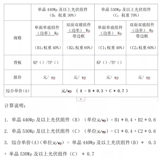 与去年类似的是,今年大唐集团仍然采用了综合单价作为价格评分方式,如下图,综合单价(A)(单位元/wp) = 单晶440Wp及以上光伏组件(B) * 0.3 + 单晶530Wp及以上光伏组件(C) * 0.7。