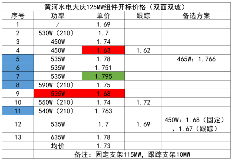 根据标书,黄河水电125MW组件采购需要于6月30日前完成交货。受供货时间影响,黄河水电此次招标价格仍然处于高位,从开标结果看,大部分厂家的报价仍维持在1.7元/瓦以上,仅有三家报价低于1.7元/瓦,均价1.73元/瓦。