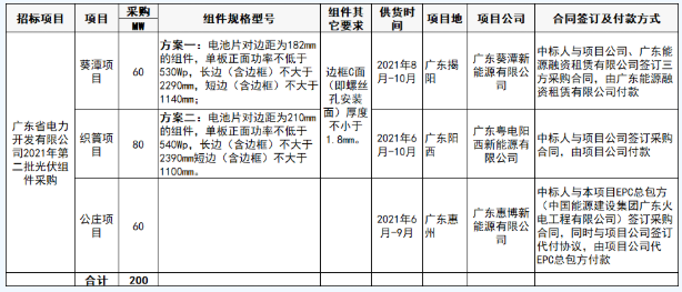 本次光伏组件的采购招标包括广东省电力开发有限公司投资建设的三个光伏项目,采购总容量为200MW,最终采购数量以各项目实际需求为准(详见招标文件技术部分)。