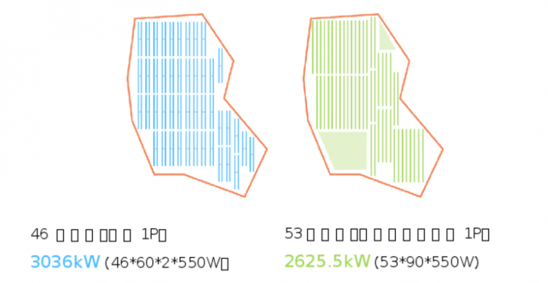 对比市场上长度110米的单排1P跟踪支架,安捷1P双排设计使支架长度更短,只有72米,这不仅提升了支架结构的稳定性,更实现相同面积更高的装机容量。安捷1P单套支架最多可安装120块组件,110米长单排1P跟踪支架最多仅可安装90块组件。在相同面积下,采用安捷1P可以实现3036K的装机量,而采用一般单排1P仅能达到2625.5Kw装机量,安捷1P装机量提高达15.6% (见下图)。