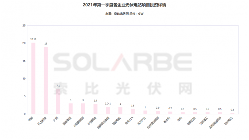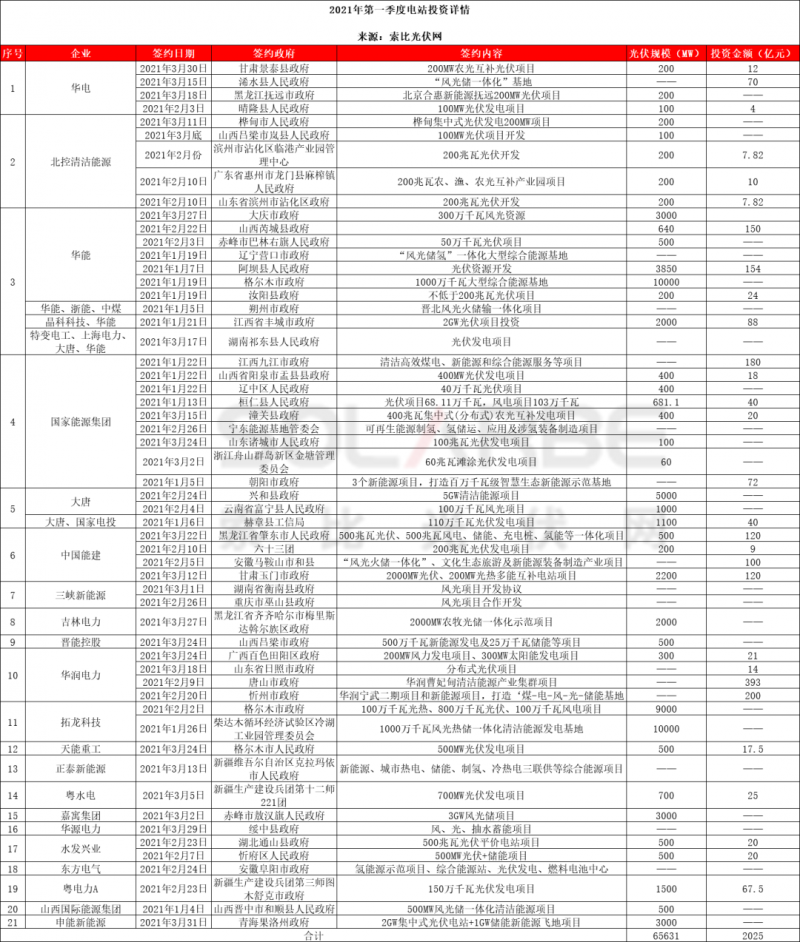 以下为2021年第一季度各企业光伏电站项目投资详情: