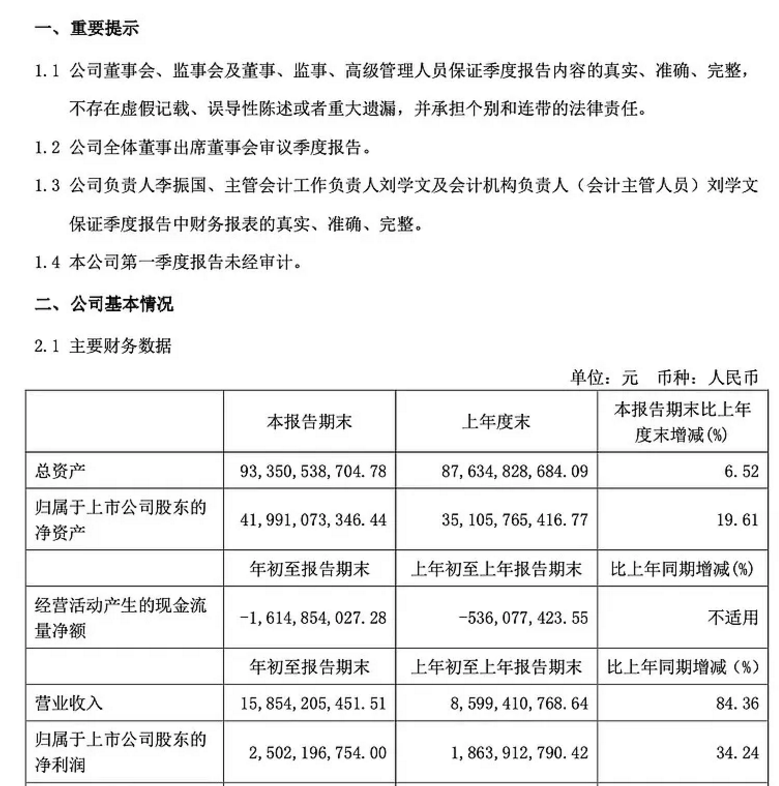 4月20日,隆基发布2021年第一季度报告。报告称,公司2021年度一季度实现总营收158.54亿元,同比增长84.36%;实现净利润25.02亿元,同比增长34.24%。同时,公司发布年度报告,2020年,隆基股份实现营业收入545.83亿元,同比增长65.92%;净利润85.52亿元,同比增长61.99%;基本每股收益2.27元,同比增长54.42%。