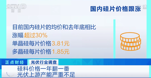 一家四川的硅料生产企业,作为光伏行业中最上游的原材料生产企业,它的市场份额占到国内最大。企业负责人告诉记者,今年硅料价格一路上涨,当前的价格同比去年已经翻了一倍,比去年底更是上涨了近50%。如今单晶用料均价达到每公斤135元,多晶硅为每公斤74元。