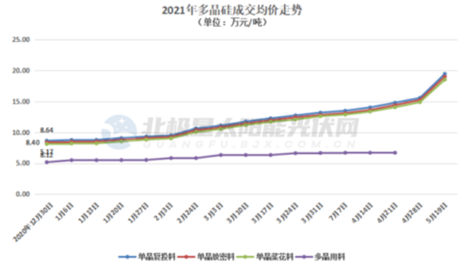 光伏产业链价格在持续刺激业内的神经,根据硅业分会5月19日的数据,国内单晶复投料最高价格来到20.0万元/吨,成交均价为19.44万元/吨;单晶致密料成交均价也涨至19.00万元/吨。
