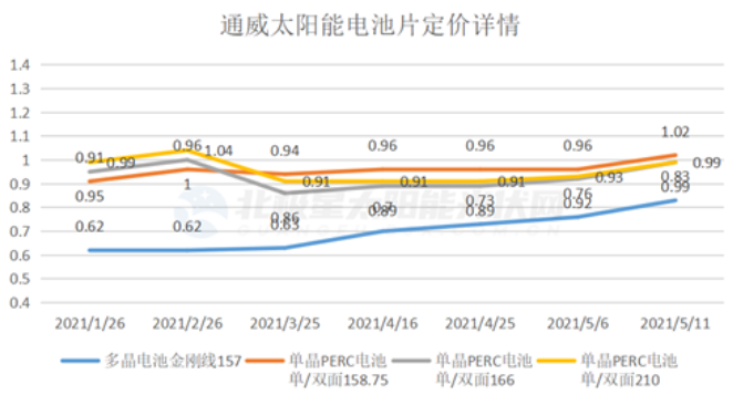 5月11日,距离上次报价仅隔5天,通威再次上调了电池片定价,普涨6~7分/瓦。其中,多晶157与M6电池片涨价0.07元/瓦,现价分别为0.83元/瓦、0.99元/瓦,涨幅为9.2% 与7.6%;G1与G12同步上调0.06元/瓦,现价分别为1.02元/瓦、0.99元/瓦,涨幅为6.25%与6.45%。