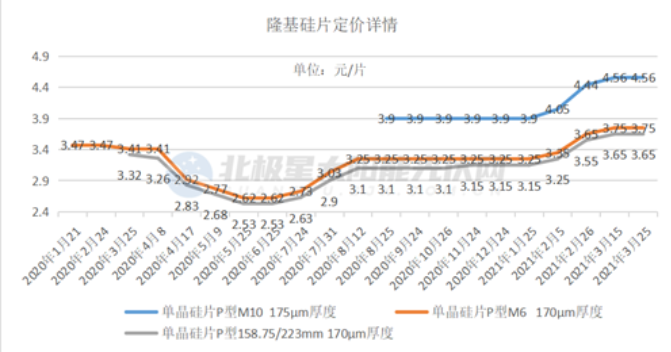 硅料价格跳涨带来的连锁反应正在加剧,本月14日隆基再度宣布上调硅片价格,与4月23日相比,G1报价4.39元,上涨0.49元;M6尺寸硅片报价4.49元,上涨了0.49元;M10尺寸硅片报价5.39元,上涨了0.53元。